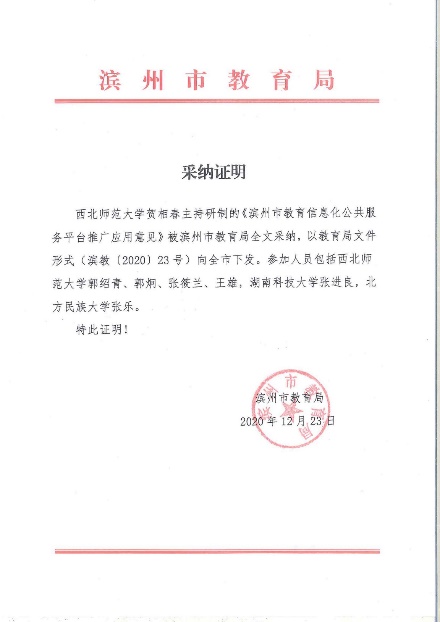 郭绍青教授团队根据《滨州市教育信息化行动计划(2021-2025年)》,在深入调研滨州市教育信息化公共服务平台建设与应用现状以及存在问题的基础上,多次与滨州市教育局、公司管理者、平台使用人员、平台建设方沟通交流,从指导思想、应用目标、主要任务、保障措施四个方面制定了《滨州市教育信息化公共服务平台推广应用意见》,该意见于2020年12月被滨州市教育局采纳,并作为教育局政策文件全文印发(滨教[2020]23号),要求滨州市教育相关部门及公司遵照执行,指导全市教育信息化公共服务平台的推广与应用。