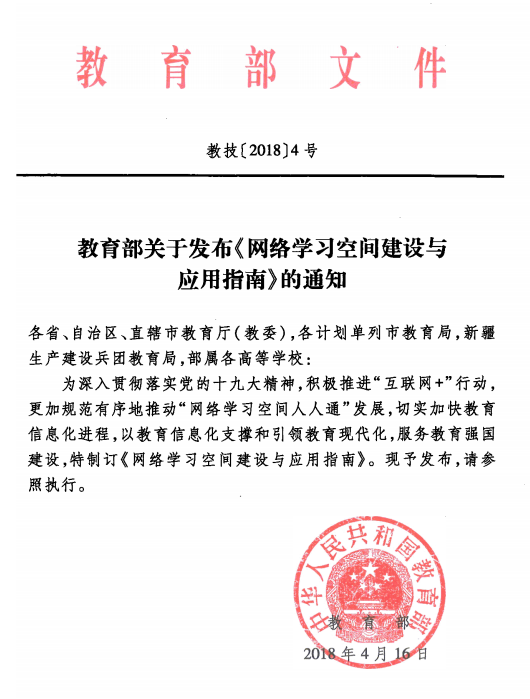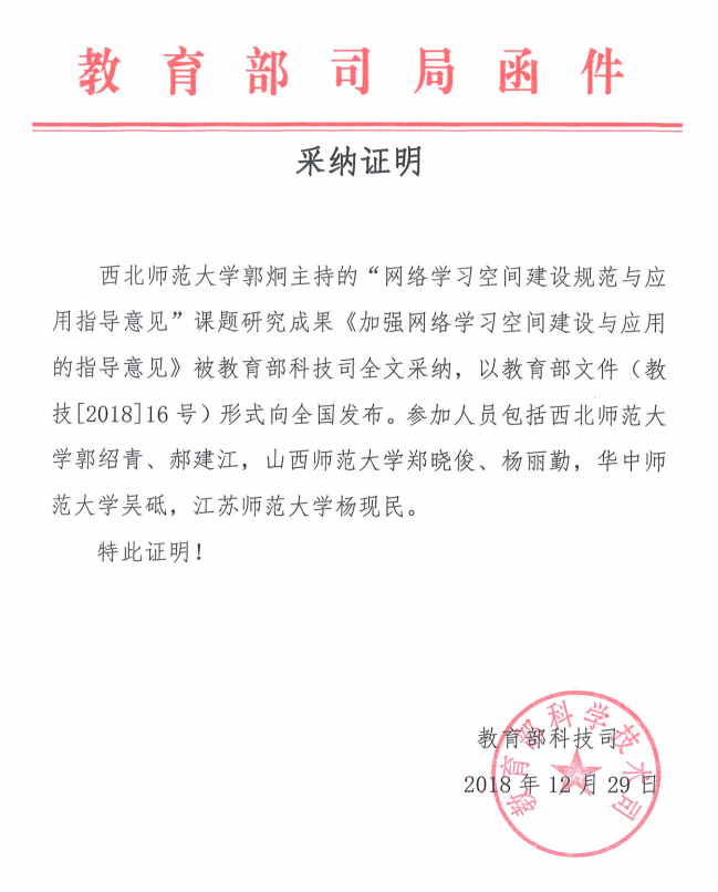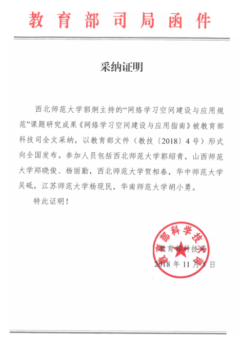 该成果于2018年12月被教育部科技司采纳,作为各级教育信息化主管部门、相关企业和公司推进空间建设与应用工作的指导性文件,以教育部“教技[2018]16号”文件的形式公开发布。该文件明确了当前推进网络学习空间建设与应用的总体目标与工作原则,提出了推进空间建设与应用的八项主要任务,并对相关保障措施给出了具体要求,为各级教育主管部门、各级各类公司明确工作职责与方向,合理制定工作规划,切实推进空间建设与应用,发挥空间效能提供了指导与依据。