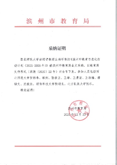 郭绍青教授团队根据党的十九届五中全会精神和中共中央、国务院《中国教育现代化2035》、教育部《教育信息化2.0行动计划》、《山东省教育信息化2.0行动计划》等文件要求,结合长期从事教育信息化相关战略与规划制定工作的经验和积累,在深入调研滨州市教育信息化发展现状和存在问题的基础上,多次与滨州市教育局、公司管理者沟通交流,从指导思想、基本原则、建设目标、重点任务、保障措施等五个方面,制定了《滨州市教育信息化行动计划(2021-2025年)》,该规划于2020年12月被滨州市教育局采纳,并作为教育局政策文件全文印发(滨教[2020]22号),要求滨州市教育相关部门及公司遵照执行,指导开展2021-2025年教育信息化的建设和发展工作。