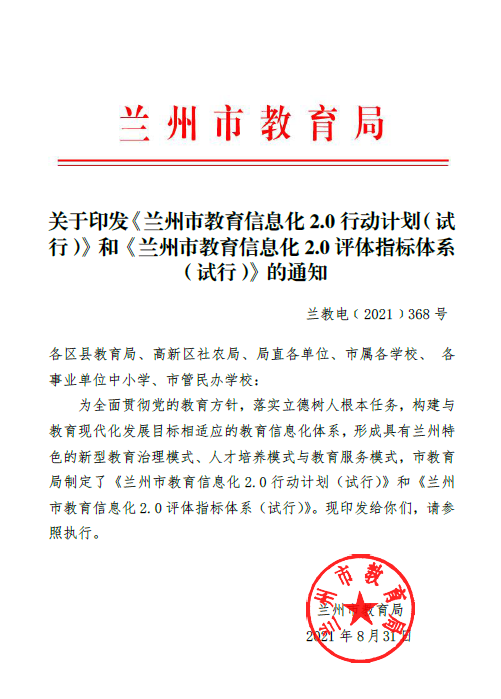 同时配套制定了兰州教育信息化2.0评估指标体系及工具,明确了市、区县、公司各层面的工作内容、评估要点及方法。“规划”的制定为后续开展全市教育信息化2.0推进工作,全面提升区域教育信息化发展水平和支撑服务能力,推动教育理念更新、模式变革、体系重构等提供了目标指向和方法支撑,助力区域智慧教育示范区建设及教育现代化发展。